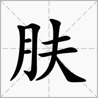 又如:肌肤(肌肉皮肤);肤革(皮肤的表皮和真皮;外面,表面);肤不生毛(皮肤上长满了厚茧而长不出毛)