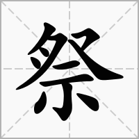 (会意。甲骨文字形,左边是牲肉;左边是“又”(手);中间象祭桌。表示以手持肉祭祀神灵。古人杀牲,一是为自己吃,再就是常把牲肉放在祭台上,“祭”字就是有酒肉的祭祀,即牲祭。本义:祭祀)