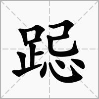 又如:跽受(跪受);跽跪(两膝着地,上身挺直);跽跗(屈膝跪倒);跽拜(跪拜);跽坐(两膝着地,臀部坐在小腿肚上)