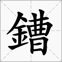 汉字:鏪部 部首笔画:8笔笔画:11划 总笔画数:19笔笔顺:撇捺横横竖捺撇横横竖折横竖竖横竖折横横简要解释:鏪cáo穿